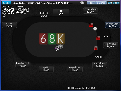6 folds, maksnet raises to $600, harshe calls $450, 1 fold