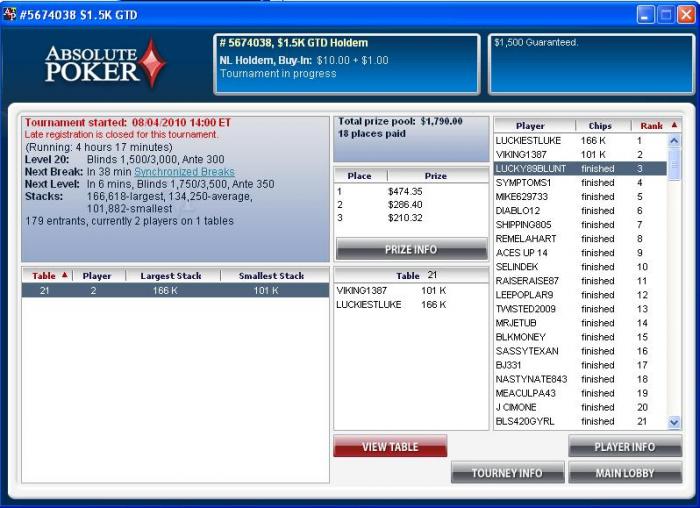 Full Tilt No-Limit Hold'em Tournament, 200/400 Blinds 50 Ante (9 handed) -