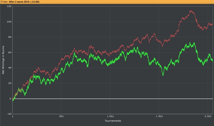 Видимо это расплата за тот перебор, который был около 50 би весной, когда я пихался с любым желающим по Ах префлоп. Я ждал такого рано или поздно, но оказалось что морально не готов совсем. Меня уже совсем не радуют сессии (хоть они и редкие такие) когда я перебираю, потому что уже чётко осознаю, что пиздец неизбежен после таких апов. Сейчас приятнее видеть график дня когда ев=профиту или около того...