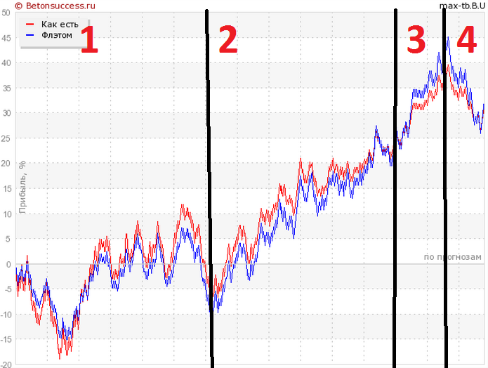 Январь 1. Даунстрик. Было много факторов: новый год сбившей темп командам, слишком крупный бетсайзинг для моей стратегии, провал в АПЛ. 2. Рабочая стадия. Команды наконец стали играть более предсказуемо, бетзайзинг снижен до 1-1.5%, хорошо стартовал теннисный сезон. 3. Апстрик. 4. Даунстрик. Начало ему породило 5 ошибок, в виде ставок на лиги, которые не играл до этого, и как итог все 5 ставок не зашли, дальше просто откат к значениям до начала апа. Кому не понятно, красная линия отражает реальный результат, и синяя если бы играл флетом.