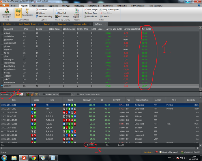 Вот я посмотрел и оказалось, что намного отличаются вкладки. В первой я заливаю пацану, а во второй, учитывая до 20бб банки, он в жутком минусе против меня.