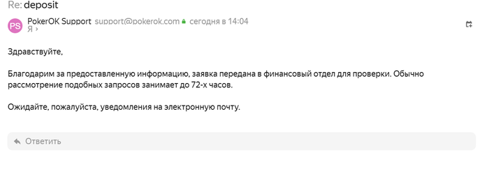 Обработав вашу заявку, ПокерОК передаст информацию платежному провайдеру. В большинстве случаев поиск платежа займет не более нескольких дней, но в редких случаях может затянуться до нескольких недель. Пожалуйста, не отправляйте повторные запросы в саппорт чаще, чем раз в несколько дней, это не ускорит процесс. Спасибо!