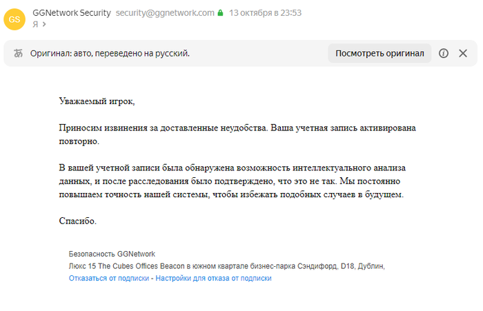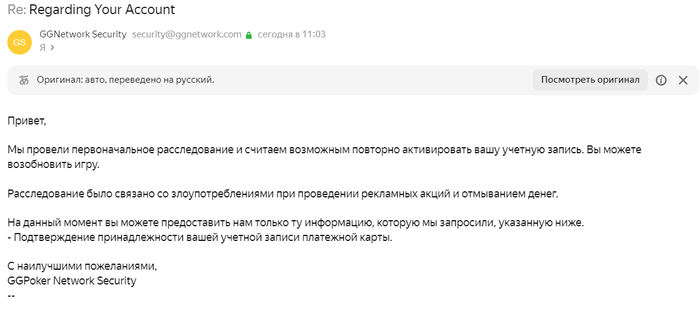 Да вроде ничего не нарушал , я думал за первый депозит что сделал с карты жены , потом скинул им наше видео с женой и карту жены , и ролик минутный с ней им отправил , она на камеру сказала что разрешила депозит сделать мне , я сказал что не знал что так строго будет и бан будет . А в ответном письме вообще про отмывку акций и бонусов получил объяснение ))) Сам не понял кроме медового месяца да билетиков КОТЭ никаких бонусов и не было . Может подумали налапничеством с кем то занимаюсь я хзнает. Так кроме туриков КОТЭ и дешёвого иногда кеша никакие дисциплины больше не играю. Отмывка денег ваще смешно , всё что выигрывал и депозитил всё им в казино слил всего то 300 баксов суммарно. Ни о каких плюсах и о том что я навыводил кучу бабла и речи быть не может , всё слито в казино по чуть чуть.Все мои деньги у них остались а не у меня : Рейкбеки, GGCare , Медовый месяц , все Котэ и так далее . Всё осталось у них всё слито !!!
