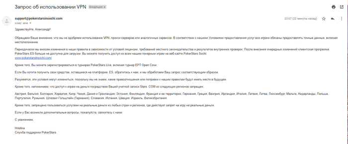 Привет, делал раньше вывод с PS ES с испанским VPN, в этот раз сделал с канадского, от сб рума пришло письмо