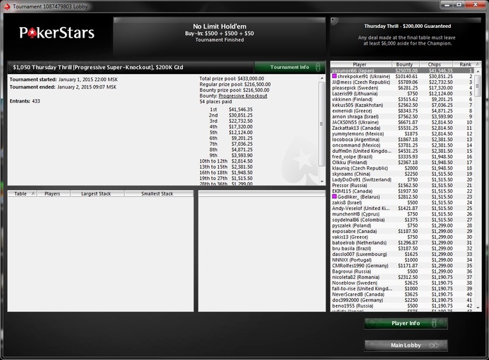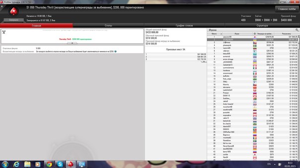 shrekpoker91 @ 2.1.2015 Короче сижу с телефона, тяжело норм запилить,thursday thrill кароч,второе место,нокаутами 10к,итм 30к,начало года мне нравится)