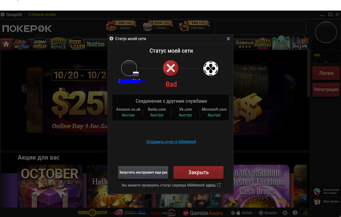 Всем привет! Ребят, кто сталкивался с данной проблемой? Интернет работает отлично, раньше спокойной запускался Покерок, а со вчерашнего дня вылезает данная проблема. Впн не помогает.