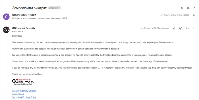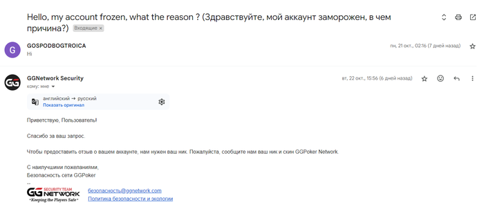 Обработав вашу заявку, ПокерОК передаст информацию платежному провайдеру. В большинстве случаев поиск платежа займет не более нескольких дней, но в редких случаях может затянуться до нескольких недель. Пожалуйста, не отправляйте повторные запросы в саппорт чаще, чем раз в несколько дней, это не ускорит процесс. Спасибо!