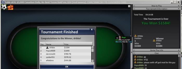 Пока не уехал на вторую страницу, отмечусь... Вчера отлично шел в $5 ребай, несмотря на то, что мне 3 раза сдали ДД,КК... при этом все 3 раза в АА) и один раз ВВ при стеке 20м (у оппа 10м)... разумеется в ДД) Потом на финалке сам сильно перемудрил, не сумев переиграть фиша, поймавшего натс)) И в итоге уже я совсем коротышом получил определенную компенсацию: с В10с убрал КК... Потом включился на полную - и вот уже в 5 макс - у меня хороший третий стек, с которым на рейз второго стека я запушил АД...там снепколл с КД - и К на флопе... Дали $560, хотя я закладывался минимум на $1,5к). Следом вылетел третьим на финалке турика за 22, словив кучу переездов и напоследок на доске 4ДАД с К8 проиграв В10 фиша, кольнувшего боооольшой оллин). В общем, еще +$560. Но поскольку план на вчера был сделать +1к, я не сильно расстроился.