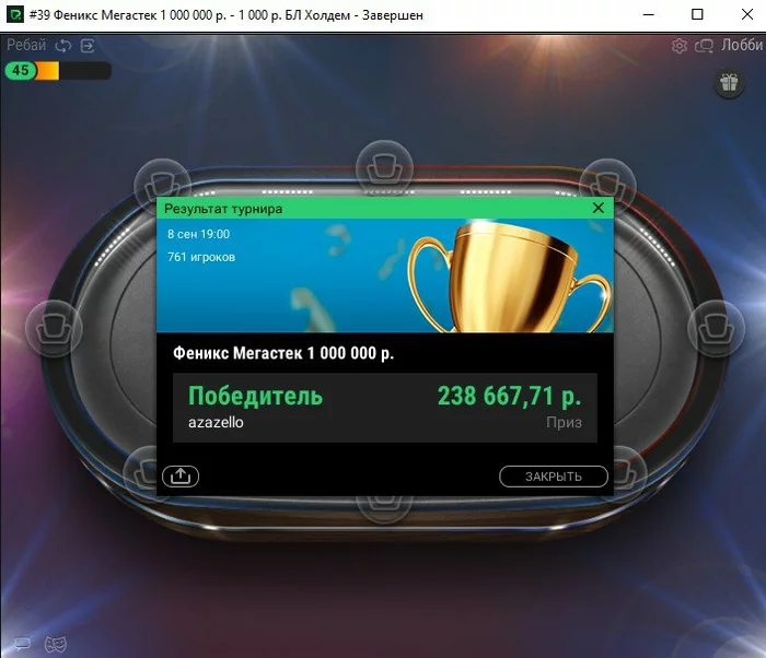 Ну кстати, "марафон победы" как оказалось я подзатащил, почти 70К за 14 место в мейне, плюс 30К профит от кеша и еще так по мелочи. Совсем забыл про него. )))