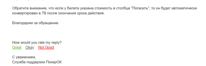 Если баланс не пополнился в течение 30 минут, напишите в саппорт и предоставьте чек (где будет видна сумма, время и получатель). Cвязаться со службой поддержки ПокерОК можно: