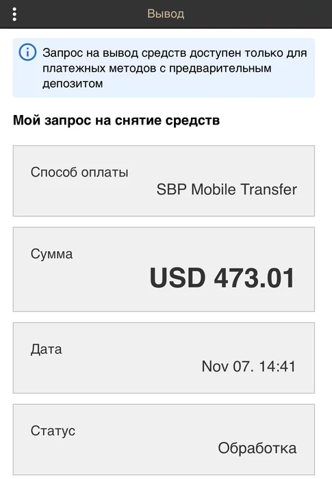 Народ, подскажите пожалуйста, если не депал через сбп, то возможно ли через сбп выводить? А то на днях зашел в кассу. Раньше бывало пользовался 100-м кп, когда он работал, а тут смотрю - все кп куда-то пропали. Доступен только один 143 сбп. Это при том, что через сбп я никогда не депал. Но раз он показан как доступный, значит по логике я могу сделать через него вывод? В итоге заказал вывод, сижу жду уже третьи сутки, а процесс всё в обработке. И да, может кто ещё подскажет, долго он так в обработке может висеть, пока уже отменят или выведут?