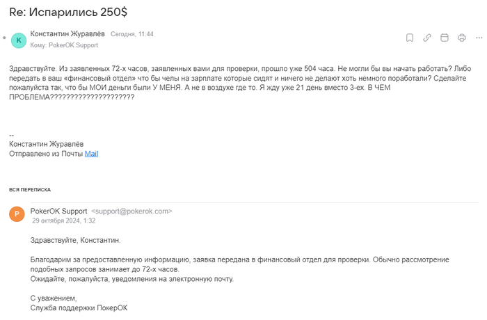 Обработав вашу заявку, ПокерОК передаст информацию платежному провайдеру. В большинстве случаев поиск платежа займет не более нескольких дней, но в редких случаях может затянуться до нескольких недель. Пожалуйста, не отправляйте повторные запросы в саппорт чаще, чем раз в несколько дней, это не ускорит процесс. Спасибо!