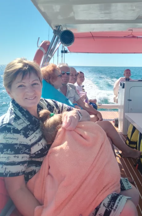 Прогулял родных. Такое было только на нашу свадьбу 10 лет назад. И мама приехала и Олины родители. Впереди мама впервые в этом блоге, запутала Полину в полотенце. Сзади нее отдыхающие незнакомые нам люди. Дальше усатый это тесть а потом Оля. За штурвалом судна в открытом море семилетний -бегранично-довольный Александр Белов. Без прав на черное море и всех остальных прав задевающих тут многих читателей😁. И я за кадром непристегнутый и фотографирующий. День супер.