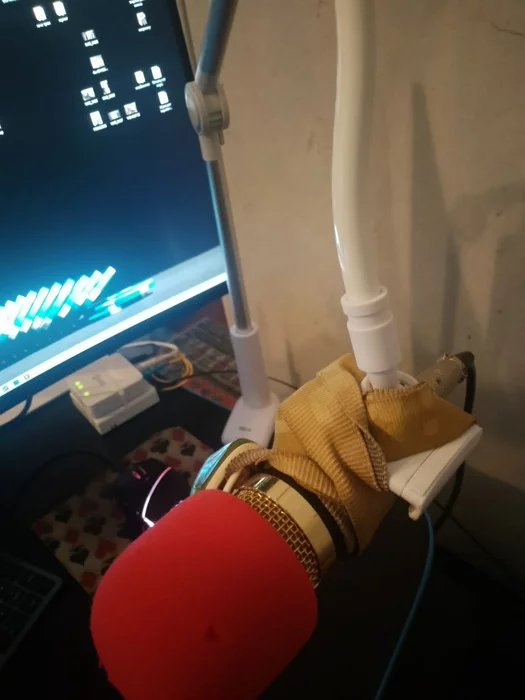 Достал свой штатив, который я покупал для того чтобы снимать видео узлов, которые я вязал на столе и выкладывал в ютуб. Прикрепил к нему микрофон на резинку от фонарика. получилось надежно)