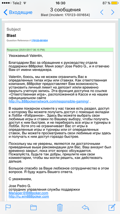 Valentin250 @ 26.1.2017 Всем здравствуйте! Написал в техподдержку 888,чтобы мне заблокировали турниры Blast. Отписались,что такое невозможно,вдобавок заблокировали аккаунт до моего ответа. На каком основании? Это создало и создает до сих пор мне дикие неудобства!
