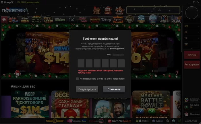 Третий день не пускает в клиент на ПК пишет введите код с почты...на почте пусто...в спаме тоже...пишу в support@pokerok.com тишина...что это ?