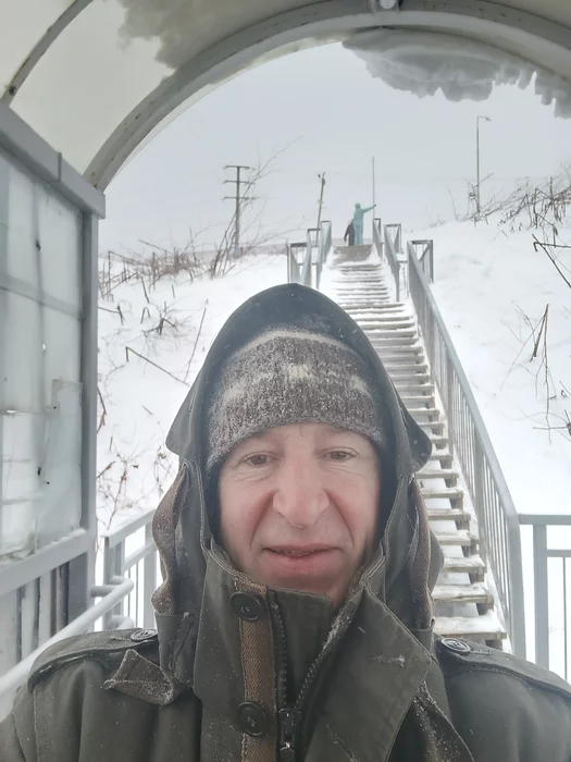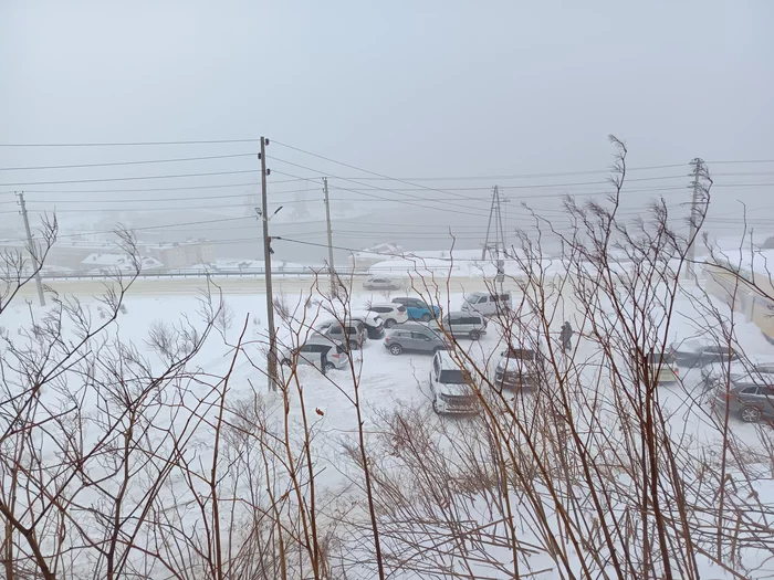 Получаю снежным зарядом в морду лица, натягиваю капюшон.. Смотрю - а не видно почти ничего впереди, ну так - с просветами. Метет изрядно. Ветер с моря близкий к ураганному, со снежными зарядами.. А за едой топать все равно нужно.