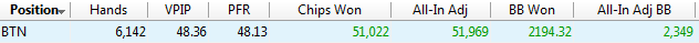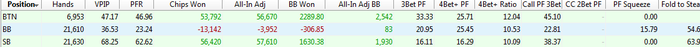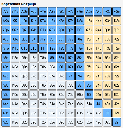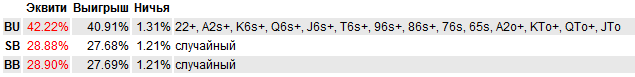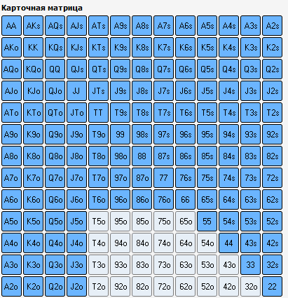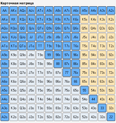 Ну и начну с самого начала, как говориться. Префлоп. 3 макс. Позиция BTN. Не много логического (на мой взгляд) отступления : На батоне мы всегда находимся в позиции и это очень важный момент. При построении спектра опен рейза, я опирался на следующую деталь. Мы открываемся против 2-х оппонентов , а значит должны разыгрывать только "хороший" спектр рук, так как часто будем получать 3-беты от СБ или ББ. Логичная логика мне подсказывает, что часто мы будем играть в мультипотах, а значит нам нужны хорошие руки, а не всякий мусор. Но с другой стороны, находясь в позиции, мы всегда можем эффективно блефовать на флопе или ривере. Вообщем я выбрал такой спектр опен рейза : Возможно стоит добавить K2s+ Q2s+ J2s+ , но мне почему то кажется кикер меньше 6-ки неоч Ну и вот результат за последний месяц такой игры по этой позиции : Не знаю насколько это хороший или плохой результат, сравнивать не с чем. Просто оставлю это тут. Может когда нибудь буду ржать над этой фигнёй, а может и нет