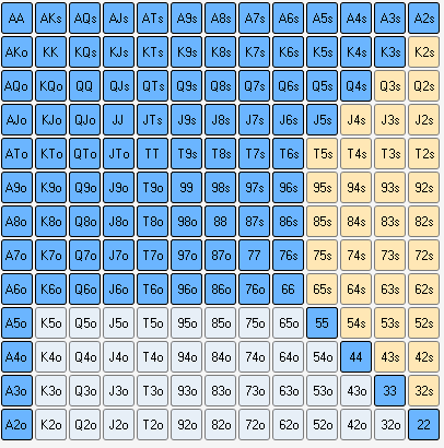 Получается 38.46%. Думаю это нормально. А про 60% я не понимаю. Если имеется ввиду открывать 60% рук, то считаю это слишком лузово, так как я писал, что часто в нас полетят 3-беты, колд колы от 2-х оппонентов (что тоже не приятно, потому что блефовать в 2-их самоубийство) Вообщем оставлю вот такой диапазон. Как раз долго думал про K2s+ K9 Q9 J9. Поверю и буду открывать.