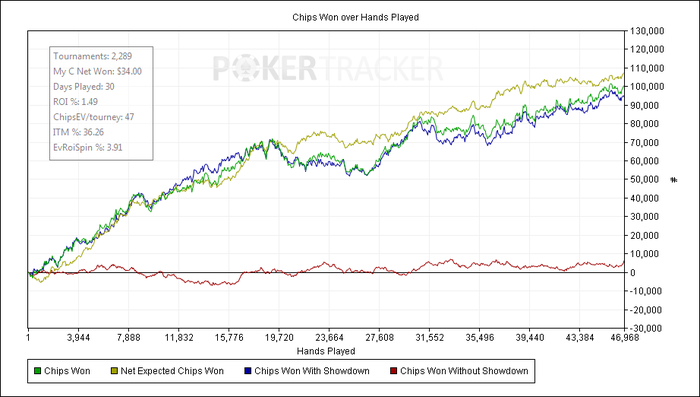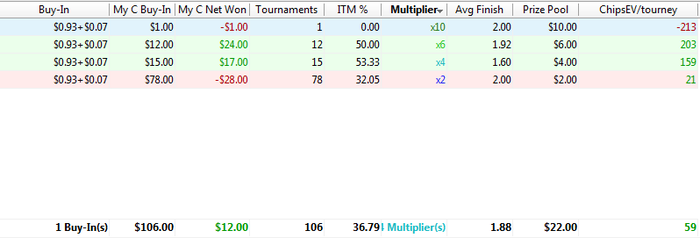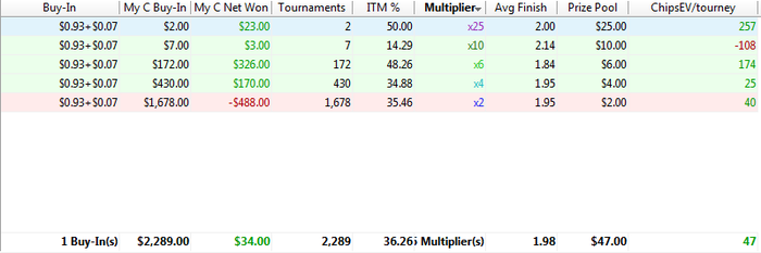 Печальный результат на единичках. Могу лиш пару положительных моментов выделить. 1) Сыграно 172 турнира х6 сИТМ 48% и с 174 чип ев. Думаю это шикарный результат. 2) Ну и 1/2 победа в х25 . Что тоже считаю хорошим показателям для топ множителя. Всё остальное не очень. Хоть и закончил с профитом в 34БИ не считая рб (я тупо покупаю билеты на спины и не парюсь)