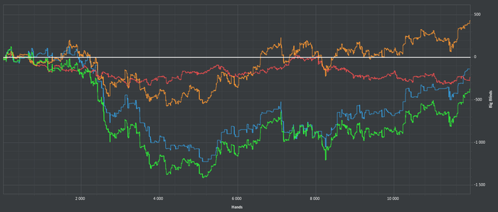 Я как-то в 5 бет банке с 200 бб стеком на флопе выставился с АА и попал в сет КК (Знал, что там скорее всего сет КК, но не удержался), увидев сет я начал мысленно материться какой я мудак и тд и меня еще и дисконтнуло вдобавок. Когда меня вернуло в игру, я обнаружил, что бр увеличился на 200бб. Запросил раздачу и увидел, что на ривере мне доехал туз