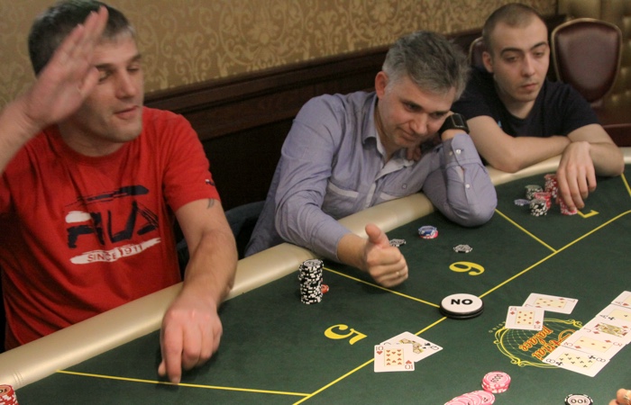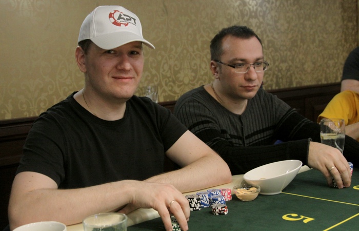 Интересная раздача. Матвеев - рэйз, два колла от Кузминского и Подольского. На флопе питерский Сергей поставил почти банк, новосибирский Сергей - колл, Иван - пас. По терну Кузминский сыграл чек-колл олл-ина. Открылись: