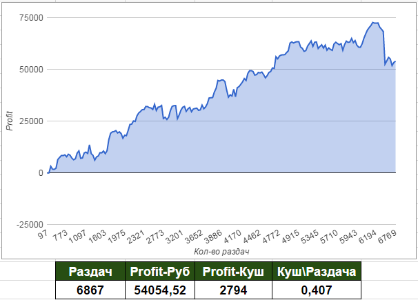 Но в целом вышло не плохо (даже с учетом слива на 50р/куш, на графике его хорошо видно)
