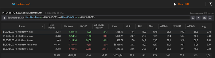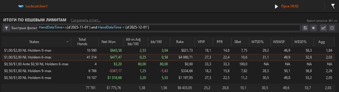 С 24-го по 27-ое включительно пропустил - проводил время с друзьями - дни рождения. В остальные дни катал, ориентируясь на своё желание катать, и на качество столов. Хоть декабрь по результатам получился тусклым, в целом я доволен тем как завершился 2025. И месяц в частности. Банкролл не просадил. Минуснул пре-рб, но не сильно. Пойдёт.