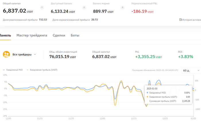 Bybit, сволочь, не даёт посмотреть доходность за период раньше, чем последние 180 дней, поэтому точную цифру не назову, но треть от общего дохода точно на bybit оставил. Сейчас там осталось 0.32$, депозитить не планирую - на этом с криптой делаю паузу на неопределенный срок. Попробую сосредоточиться на том, что приносит доход, а не убыток. Г - гениально.
