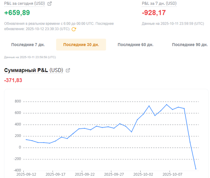 У меня в целом всё нормально. За пару часов до основного слива начал набирать небольшую позу по альтам - к тому моменту весь рынок альтов подслили без откатов, ловил локальный отскок, но как оказалось это было только самое самое начало отвесного падения. Не знаю точно до какого плеча набрал позу, где-то х1.5, большая часть позиции была по эфиру и бнб, поэтому ликвидации избежал. Весь слив пропустил, был занят, увидел уже где-то через час после, но, вероятно, и к лучшему, потому что при -50% на каком-нибудь TON, я бы уже был по уши в плечах, а его в итоге свозили на -80%. В общем, не понятно как действовал бы - возможно, набрал бы позу с плечами уже на половине падения и привет дядя Коля.