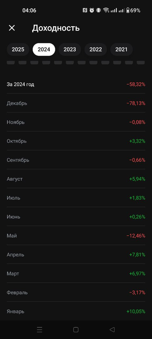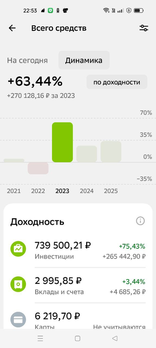 •2023 - эффект низкой базы - ралли всего и вся после паники 2022 года. Было весело. В зелёном банке тот год закрыл в +73%, в Т банке в конце потерял половину профита за год уже даже не вспомнить на чём. Тоже хороший опыт. Думаю, сейчас такой год мог бы закрыть в +150-200% - на тот момент уверенности в своих действиях не хватало. Надеюсь, в будущем на нашем рынке ещё будут подобные "праздники".