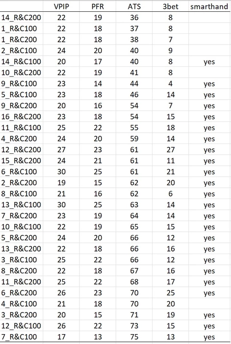 Возможно, что тем, кто не катает регулярно раш на ГГ, не так просто оценить очевидность этого кейса. Но, поверьте, это реально бросается в глаза. Сейчас (примерно час ночи по Москве) в лобби R&C 100 и 200 в сумме 30 человек играющих 4 стола (максимум на ГГ на один лимит раша). Я посмотрел статистику каждого и занес в табличку: vpip, pfr, ats, 3bet и тречится ли ник по смартхенду (т.е. играл ли этот аккаунт в кэш). Табличка ниже, отсортирована по стилу для удобства. Ники обезличены. Угадайте, кто из них есть в нашем списке? Но дело не только в статах, на самом деле. Их поведение за столами практически одинаковое. Отличаются только сайзинги (хотя и тут тоже есть странные совпадения). Сейчас их, кстати, меньше. Возможно, чтобы поменьше пересекаться друг с другом за столами, т.к. и игры сейчас заметно меньше, чем днем или вечером.
