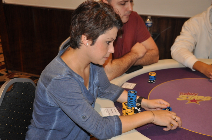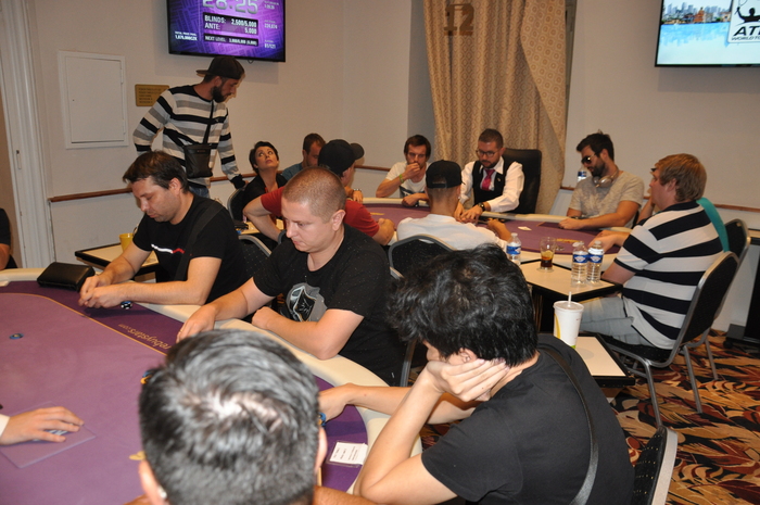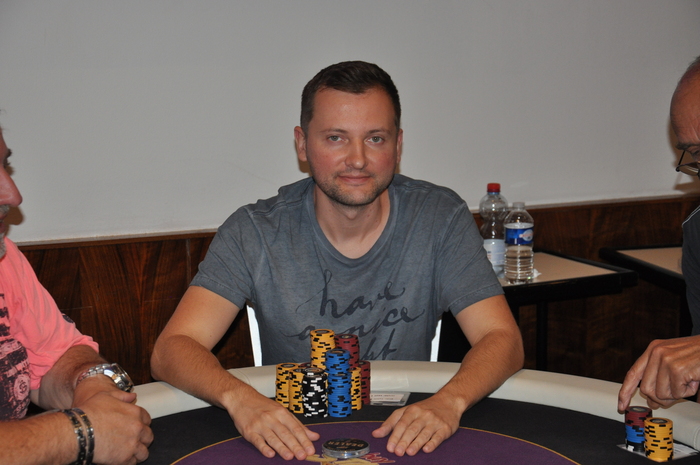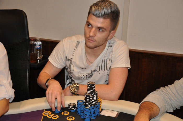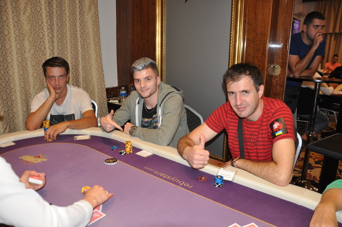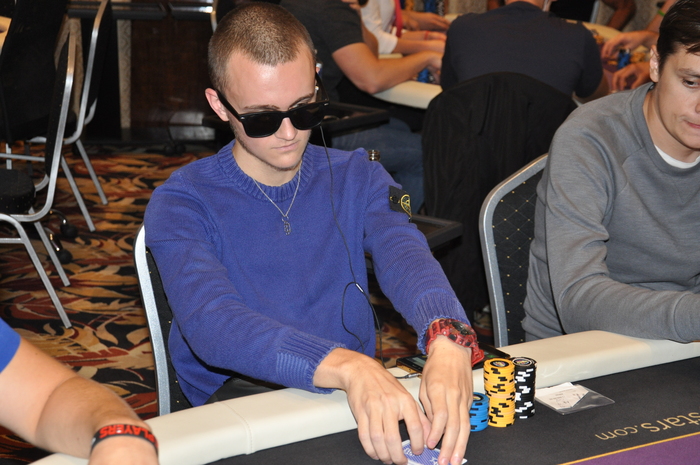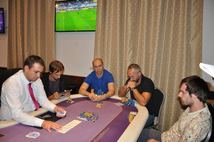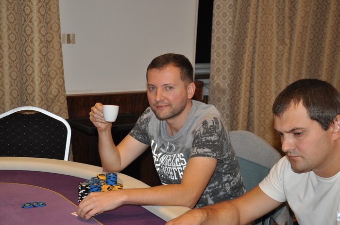 Это Серега из Луцка. Он стал баббл-боем сателлита, зашел за 500 евро и теперь у него около миллиона фишек Наш боец один из чип-лидеров турнира Блайнды 3-6 к