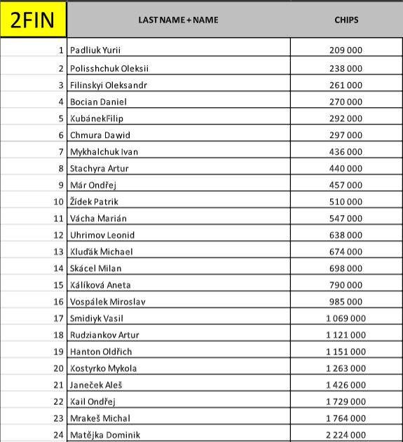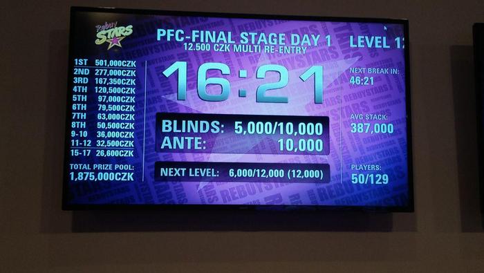 Появились призовые. Минимальные выплаты составят 26 600 крон (1 060 евро). А победитель Prague Championship получит 501 000 крон (20 000 евро). Сегодня игра продолжится до зоны ITM. Удачи всем нашим!