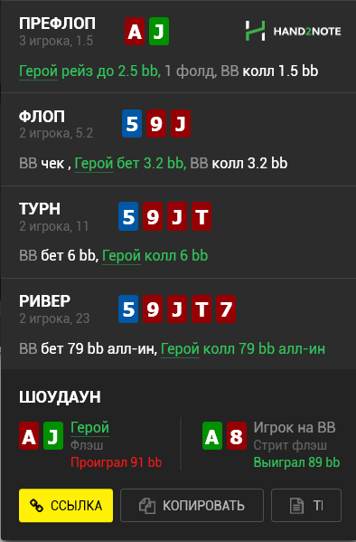 вот пример раздачи, сижу такой, большой стек набил, и думаю, дай отморожусь, вижу меточку хобби игрока и такой, ну можно..