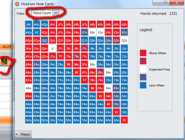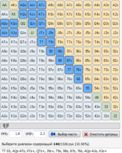 Поищем их диапазон кола. Для этого у нас есть в холдеме кнопочка "show\hide the hole cards grid". Жамкнем ее, предварительно выставив впип йес, пфр ноу, опенрейзер думаю понятно где.