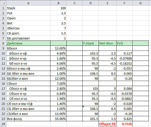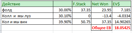 Конечно это супер упрощенно все, но в целом видно, что если считать только до флопа (не учитывать терн, ривер и наш выигрыш на шд), то все равно мы будем лупить в плюс. Свой кбет я правда выставил в 80%, по факту у меня он 60. Щас еще вспомнил, что я забыл донки пощитать, ну да и ладно уже.