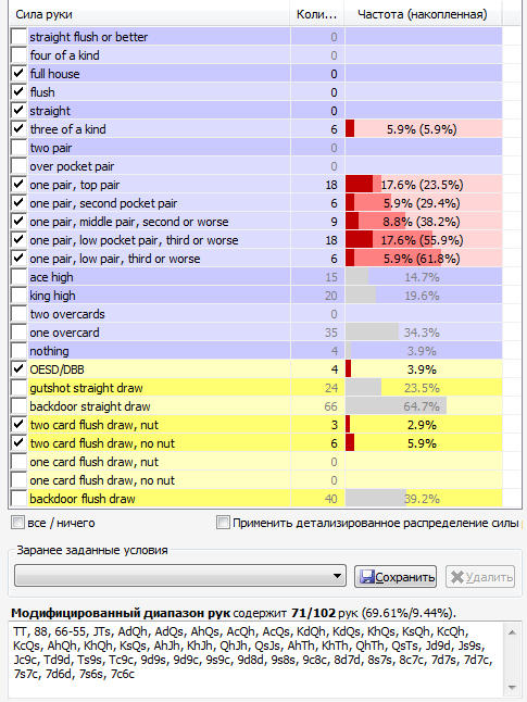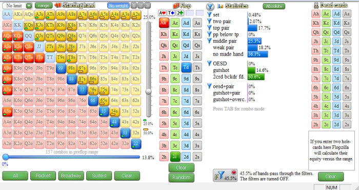 Забив это дело флопзиллу и слегка убавив частоту некоторых рук, особенно тех, что в 3бет чаще уходят, мы заделаем очень правдоподобный 13% диапазон кола среднего оппа с нашим впипом. В этой же флопзилле, которую я так и не купил (((((, мы сможем поприкидовать, как наш средний опп попадает в доски.