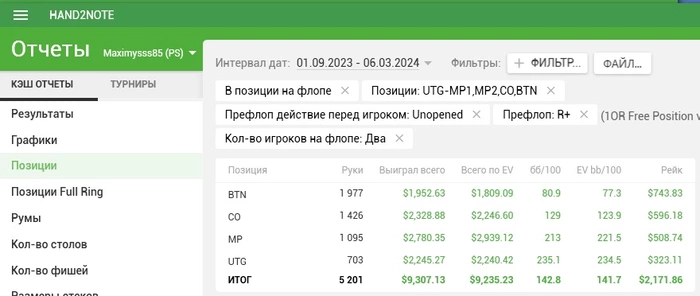 Для начала я создам набор фильтров и проанализирую свою базу в этом споте, цель определить мои винрейты как рейзера с разных позиций. Дальше я проанализирую винрейты топ регов 200-500 в этом споте и найду оптимальные. В ноябре я проводил подобную работу в очень урезанном варианте и выяснил интересный факт, у разных топ регов с похожими общими винрейтами результаты в различных спотах могут сильно отличатся, кто то хорошо играет как рейзер, но имеет достаточно посредственный винрейт как коллер и тд. Цель этой работы найти путь к оптимальному вирнейту в каждом споте, взяв самое лучшее у каждого что бы создать в итоге условно идеального игрока