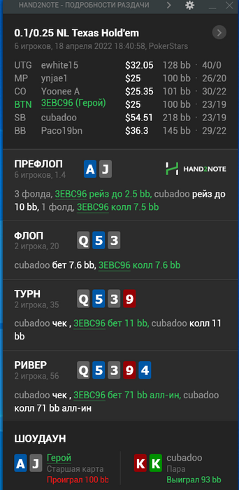 3EBC96 @ 18.04.22А вообще, пришла интересная идея, чтобы хоть как-то себя мотивировать в такое непростое время. Объявляю для себя челлендж. 100к рук к концу мая, с ев винрейтом не ниже 10бб на 100. Лимиты нл20-нл30. Результаты выложу в конце периода. Если не выполняю, при условии что не было форс мажоров, типа блокировки румов - провожу бесплатную треню для регов нл2-нл10