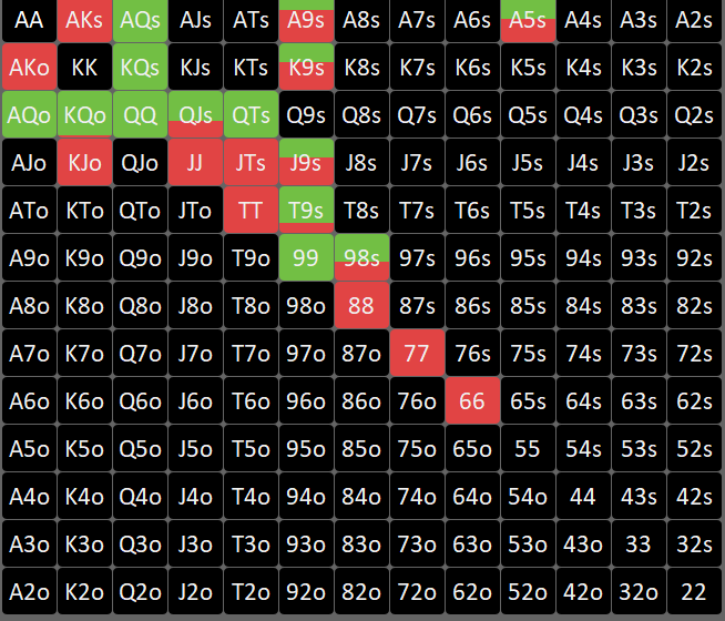 Вот так солвер видит его игру на ривере. По факту здесь основная часть поля будет оверфолдить. Скорее все будут выброшены все 9х руки, и возможно QTs в большинстве случаев, или как минимум в половине, поэтому можно расширить диапазон блефа.