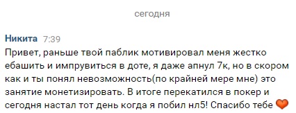 Вторая история - не совсем история, в общем мне просто написал практически незнакомый мне человек, с которым я за всю жизнь перекинулся парой предложений в ЛС и всё. Но он был подписан на мой паблос по дотке и следил за развитием.