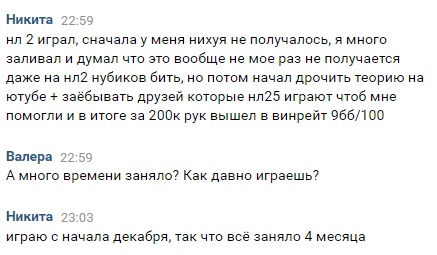 Мне пиздец приятно было, я прям очень рад, что получается в пассивном режиме делать что-то хорошее и помогать кому-то, но это заставило меня задуматься вот о чём: у меня уже 4-6 месяцев есть 2 ученика, которые до сих пор не побили нл5, по сути в текущий момент оба играют нл2, хотя один и вынужденно в зуме из-за фриза на ПС. 4-6 ебучих месяцев, с учётом того, что я максимально саппорчу им, записываю по кд какие-то видосы, разбираю все их раздачи, базы итп. Я реально делаю дохуя, не знаю что еще должен делать тренер, очень много часов трачу на это обучение, уже 1000 раз пожалел, что согласился. Но прогресса никакого почти нет. А в чем проблема? В том, что за 6 месяцев ни один из них не откатал даже 100к рук. У людей есть другие занятия, какие-то работы/увлечения/лень итп. Я на нл10 с учетом обучения откатывал по 55-60к рук за месяц на рег столах, когда просто понял, что хочу жить не в долг и вкусно кушать. Мой ученик играет 35к рук в зуме за 2 месяца. Суммарно за этот год мне написало человек 7-8 ирл знакомых, включая бывших хейтеров с просьбой обучать их покеру - остальные не прошли даже до такого уровня, слились на этапе игры на виртуальные фишки или залив первый бр на нл2. А тут человек, который не получал от меня никакой помощи - уже превзошел их всех вместе взятых. И при этом он не писал мне, остальные обратились с просьбой помочь/научить/потренировать - он всё сделал сам. Почему? Просто потому что он трайхардил. Если человек сам хочет и старается, то ему не нужно нихуя, ставишь цель и ебашишь по 200 часов в месяц в берсерк моде, оправдания для слабаков.