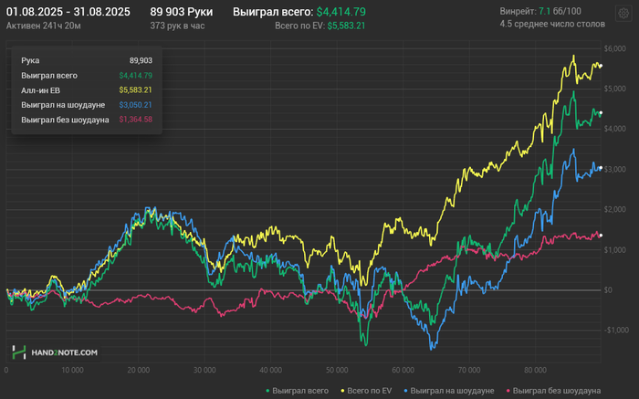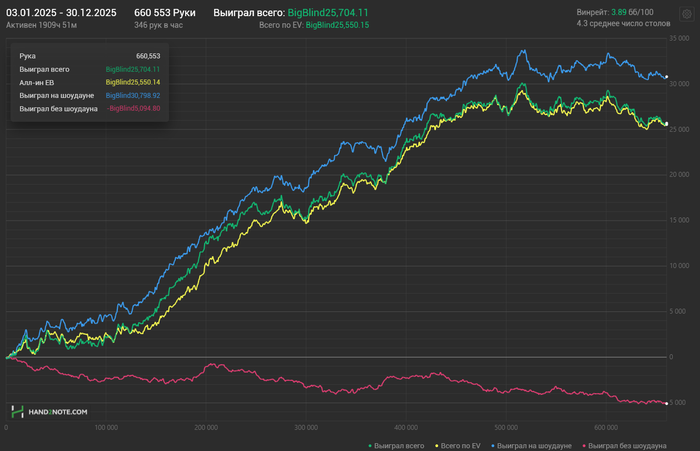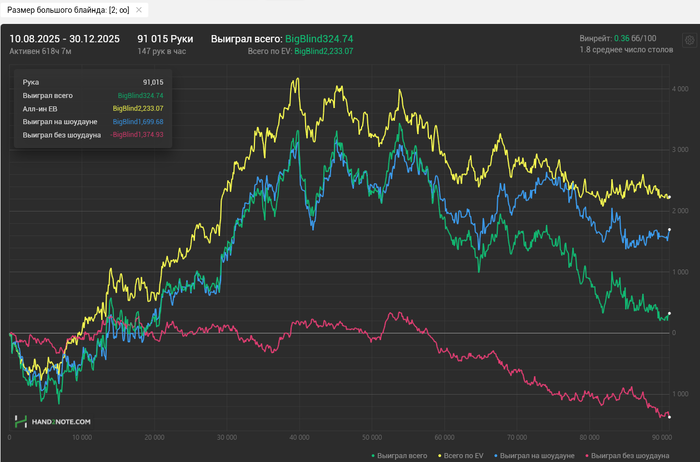 Прошлый был в декабре 2024. После отпуска планировал отыграть около 60к рук, втянуться постепенно, но было уже 18-19 число, а профита всего около $700 при необходимом выводе около $3k. А дальше маятник качнулся в обратную сторону.