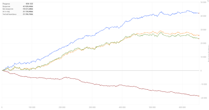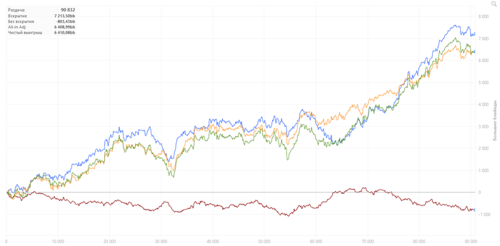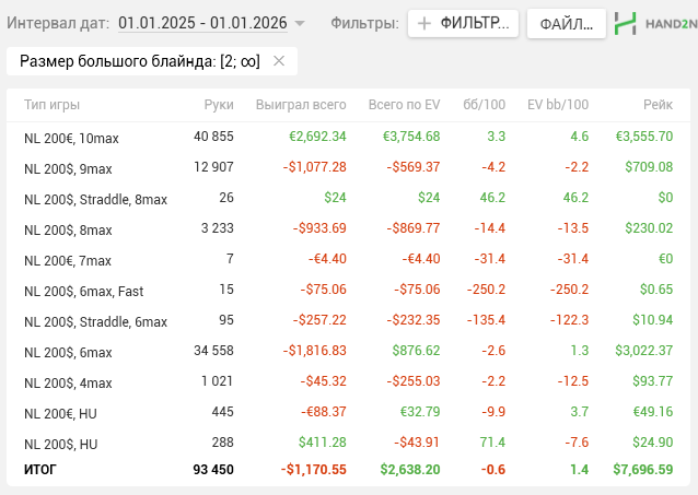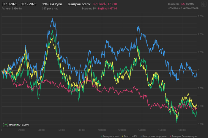 Год в целом оставил противоречивые чувства. Если брать первые 10 месяцев, то вроде бы все хорошо, но последние 2, когда меня ушатали, снизили и винрейты, и ощущение уверенности за столами. Несколько потерял вот эту нить игры, которая позволяет делать сложные действия и принимать дисповые, но +ев решения. Появился даже какой-то страх поставить/зарейзить, потому что постоянно утыкался у оппонентов в натсы. Вырос WTSD и упал WWSF, потому что у оппонентов всегда были руки, и обычно сильнее моей. В итоге получился отрезок 200к рук в 0 по ев в бб.