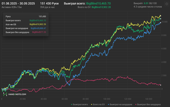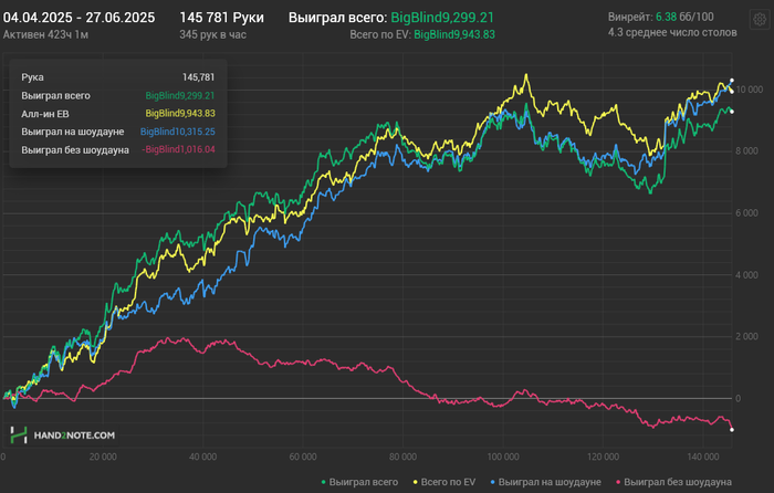 Поздравляю ) Если такие дистанции откатываешь в солидный плюс за месяц, то у тебя большое будущее, потому что уже заложена база правильных интуитивных решений, которые постоянно принимаешь при мультитейблинге. Главное не очкуй играть выше и не застревай в зоне комфорта.