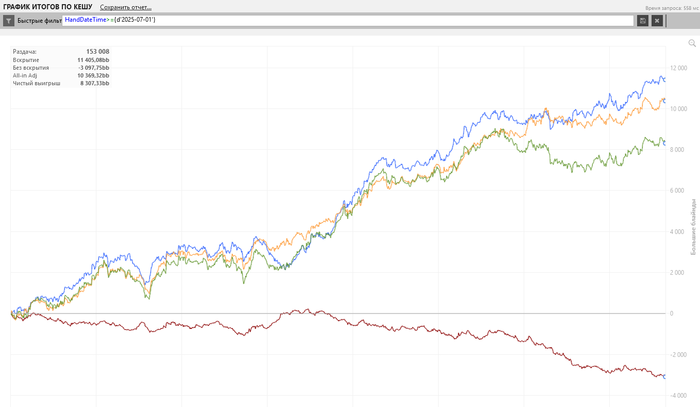 11.08 в понедельник не хватало столов днем и добавил нл 200 в загрузку. В итоге за 5-7к рук улетел на 10 стеков, основная недодача была на нем, уже готов был отключать и фиксировать потери, но вовремя начали отдавать.