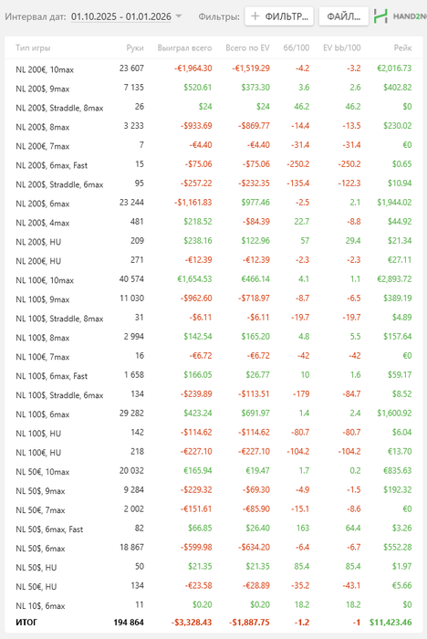 Smozgly @ 02.01.26Весь винрейт на WPN на 200 убили бомб-поты. Да, диспа была не на моей стороне, много натсов с флопа к риверу превращались в тыкву, но чувствуется, что оппоненты там меня переигрывают. Общий проигрыш в бомб-потах за год $2,9k. Подключил Чико, а там их еще больше.