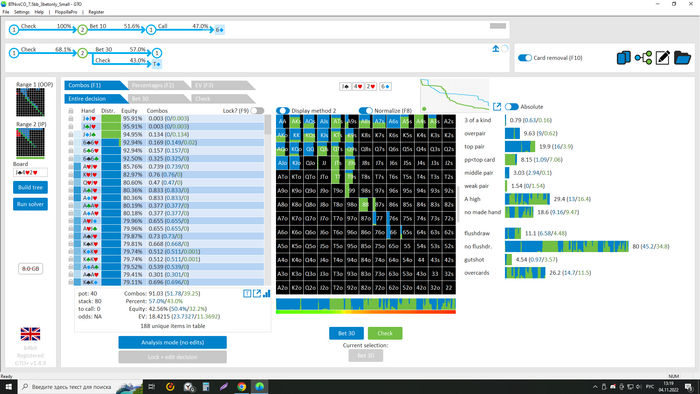 Intelligent8, мне еще на скрине разобраться задачка та еще) Но спасибо за время потраченное. Это GTO+? Тут можно посмотреть как ОПП играет на мою крупную по терну? Что он пушит так или нет пуша с блефами вообще при таких шансах банка?