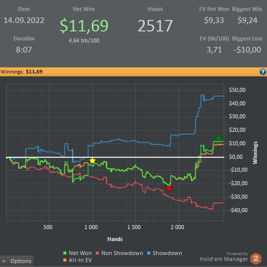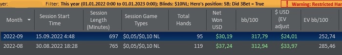 1) 20/12/5,6 ноль 4 бет (на 445 рук в +45бб) втсд 36, всд 69, ввсф 53. Агрессия 32/40/19 Не знаю как я расстался с КК, но пахло жаренным..